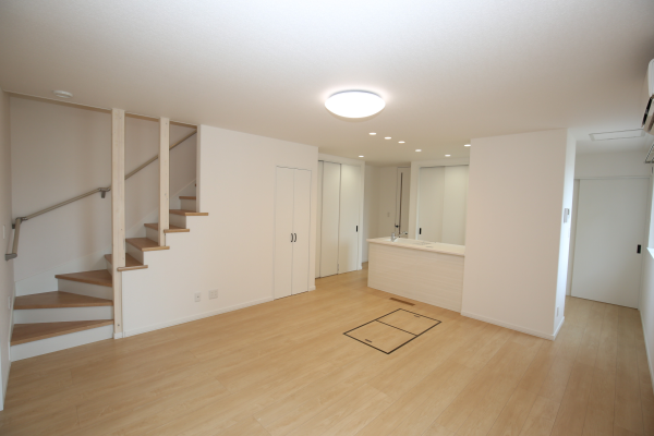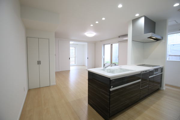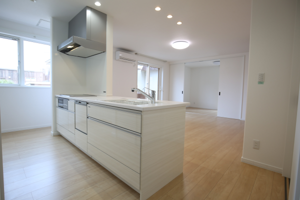 ▲ 親世帯の居間 タカラ製フラット対面キッチン仕様で背面造作収納たくさん!