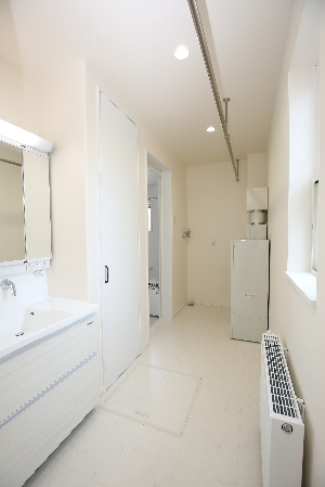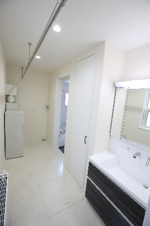 ▲親世帯の洗面台(左)・子世帯洗面台(右)たくさん物干しができるパイプ付