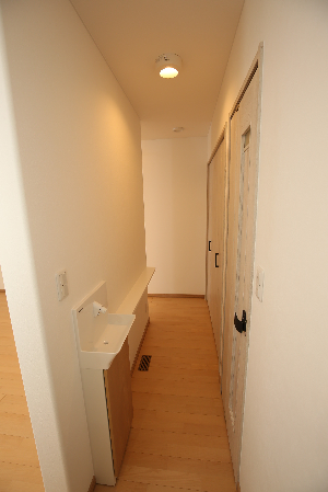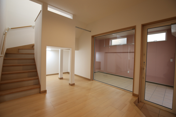▲踊り場付の階段室 下部収納はオープン形式に運動用の鉄棒を付けました