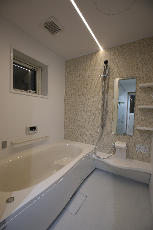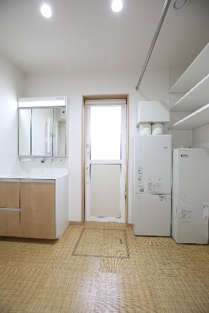 ▲お風呂からの星空を眺めれるよう窓を高めに設置 ゆったりとした洗面脱衣室