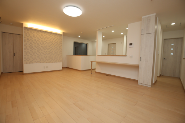 ▲キッチン裏収納たっぷりのパントリーとリビング空間に目立たないようにトイレ設置