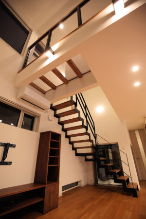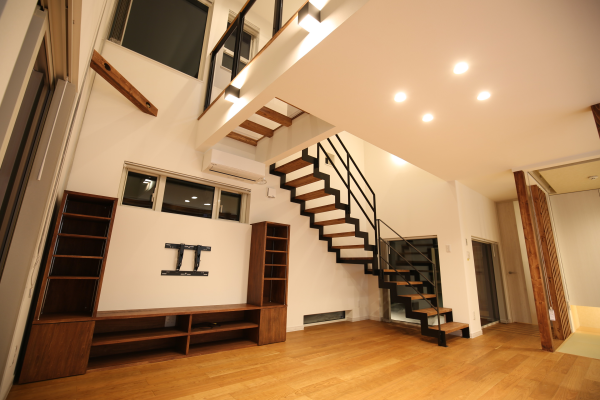 ▲リビング スチール製オープン階段に造作テレビ台・無垢材を採用