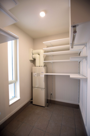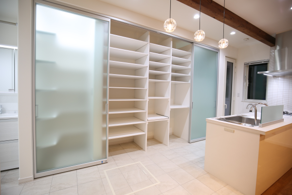 ▲奥様こだわりの全収納タイプの大型パントリー収納高さも2600までフル活用