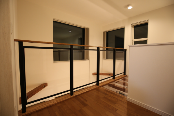 ▲吹き抜けの手すりは日差しを少しでも多くとるためにガラス式へ