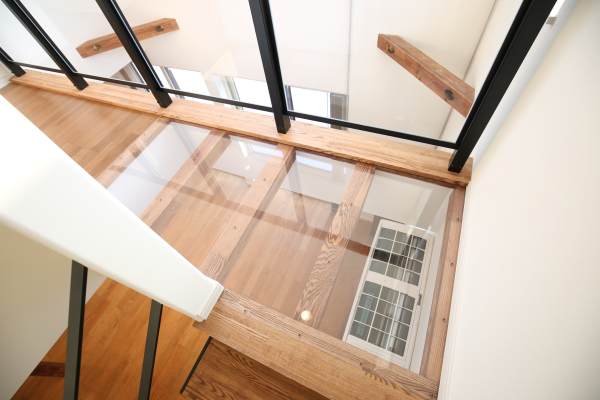 ▲階段上がってすぐにスケルトン床 お施主様こだわりの一品!