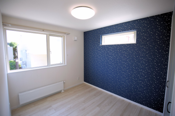 ▲2階子供室壁一面を蓄光タイプの壁紙を貼りアクセントに