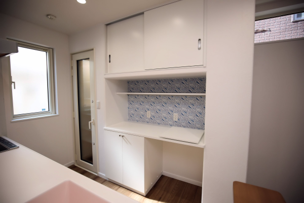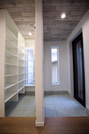 ▲ キッチン後ろには造作のパントリーと外部流入方式の食品庫