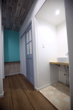 ▲ スヌーピーのかわいい壁紙を貼ったトイレに手洗い外に出しオシャレなベッセル式