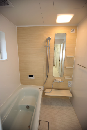 ▲ ゆったり洗面室とTOTO製のほっからり床の1坪タイプお風呂