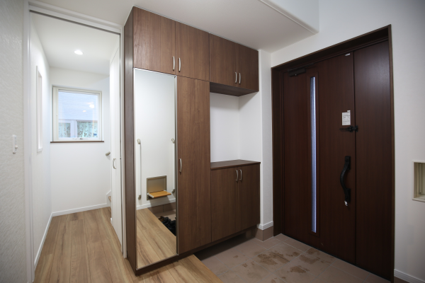 ▲車いすも回転できる広々玄関と普段使いの靴を収納する大型下駄箱